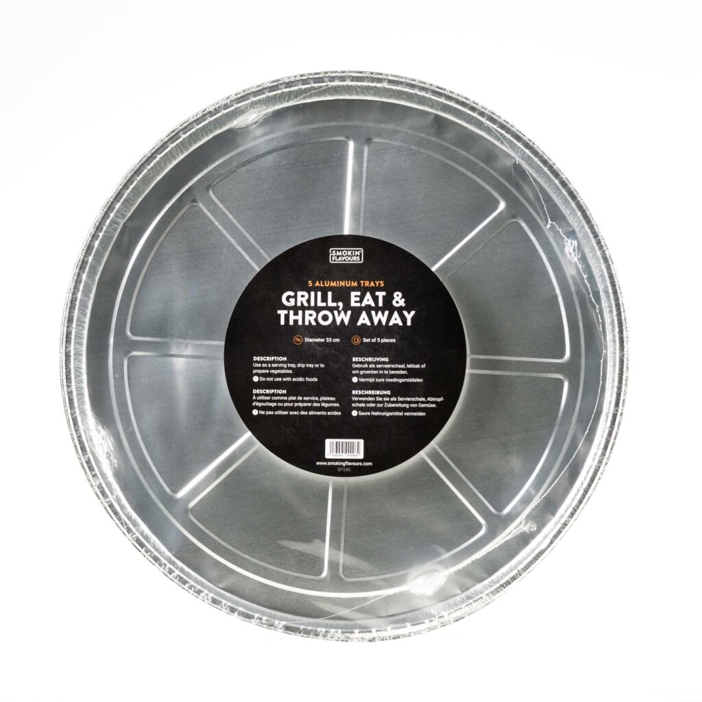 Aluminium bakken wegwerp druippan rond 5 stuks Smokin’ Flavours kan worden gebruikt voor de BBQ om indirect te grillen, vet op te vangen of om gerechten in te bereiden.