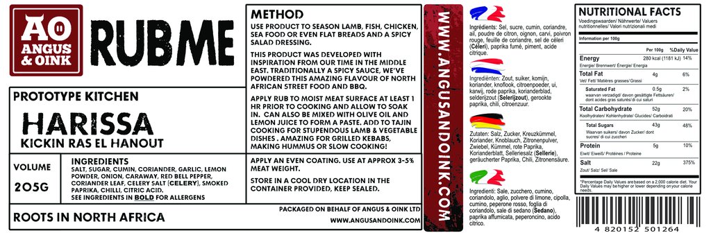 De ingrediënten van Angus & Oink Harissa zijn zout, suiker, komijn, korianderzaad, knoflook, citroenpoeder, ui, karwijzaad, rode paprika, koriander blad, selderij zout, gerookte paprikapoeder en chili.