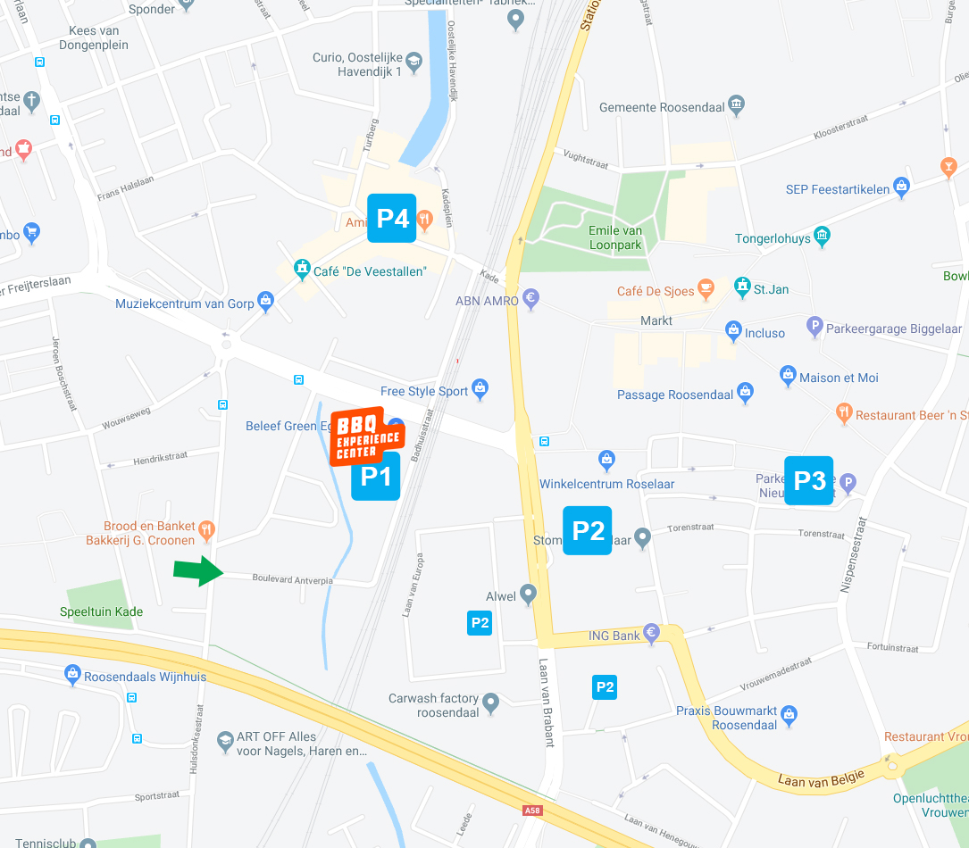 • P2 = Parkeergarage de Roselaar / Mill Hill / Liga (deze liggen vlak bij elkaar). Laan van Brabant 13. Parkeren gehele dag voor slechts € 2. Loopafstand 3 minuten. Let op, open van 11:15 tot 18u. Je loopt via markttunnel naar kruising Badhuisstraat, trapje op en je ziet het BBQ Experience Center naast je.