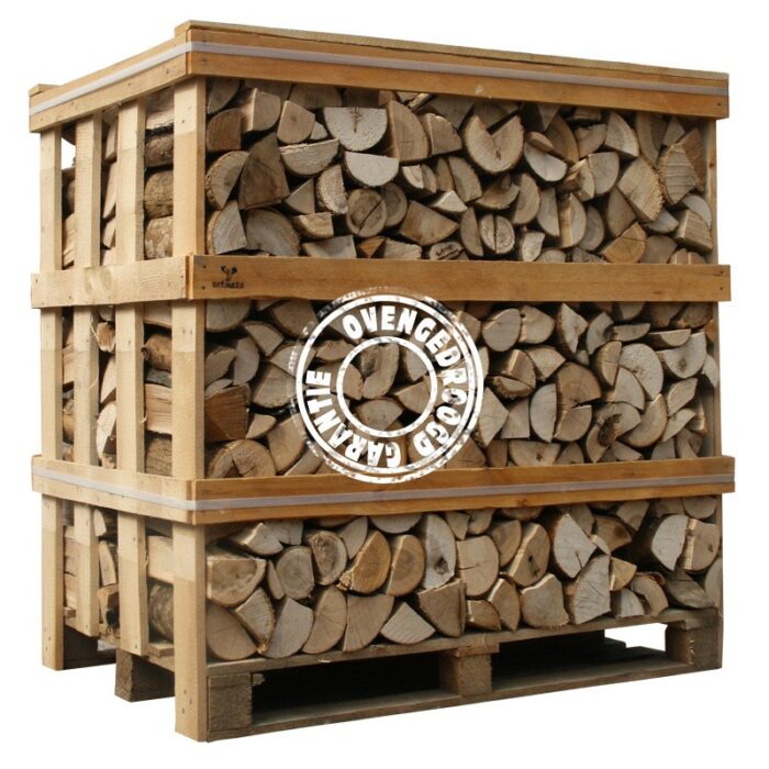 De normaal gekloofde stukken zijn ± 25 cm. De afmetingen van de kist zijn 120 x 80 x 105 cm, met een inhoud van ± 1 kuub.