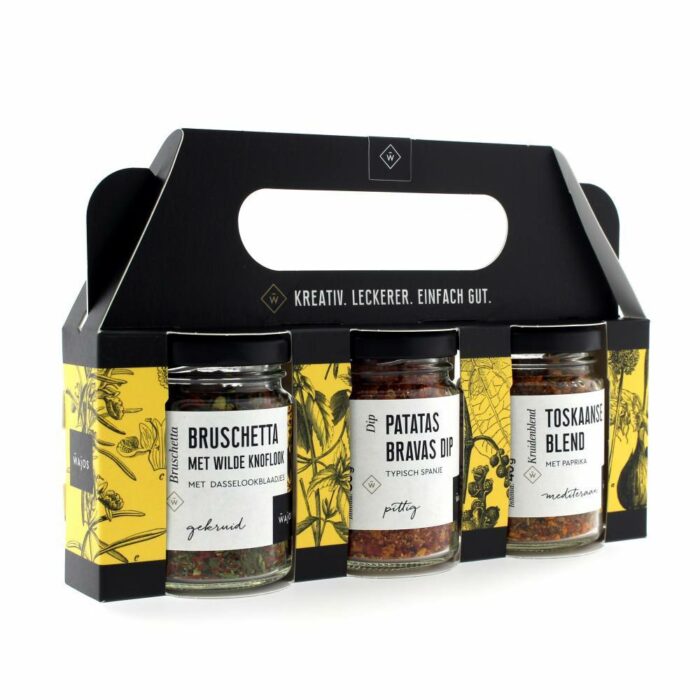 De Cadeauverpakking BBQ-kruiden Wajos bestaat uit drie smaken, namelijk: Patatas Bravas, Wild Garlic en Tuscany Blend.