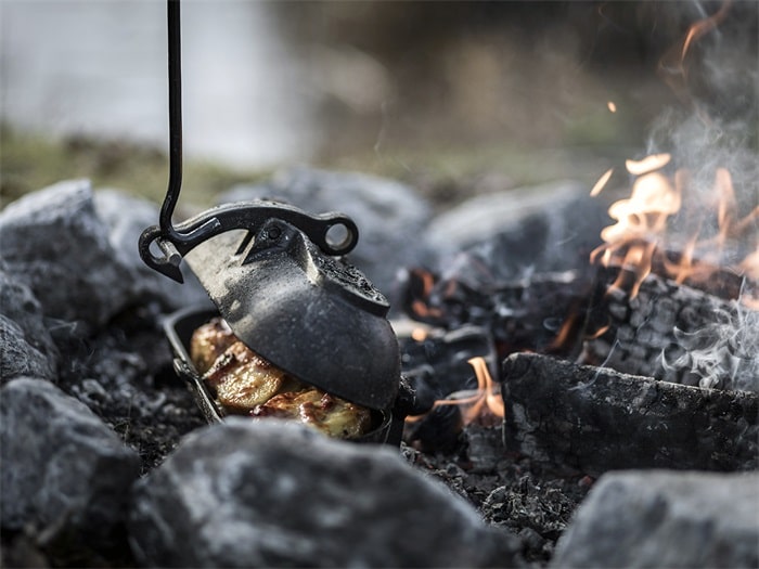 Je kunt de Gietijzeren Aardappel Oven Petromax met een deksellifter en de handige ring aan het sluitingsmechanisme gemakkelijk uit het vuur halen.