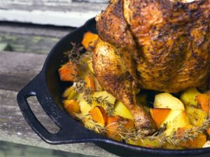 Terwijl het vlees in de Gietijzeren Gevogelte Braadpan 30 cm Petromax kookt, stromen de overtollige vetten en vleessappen in de lekbak. Dit zorgt ervoor dat het gevogelte van buiten een heerlijk knapperig vel krijgt en van binnen mals en smaakvol blijft.