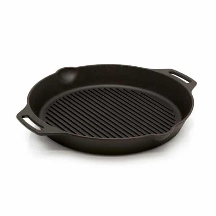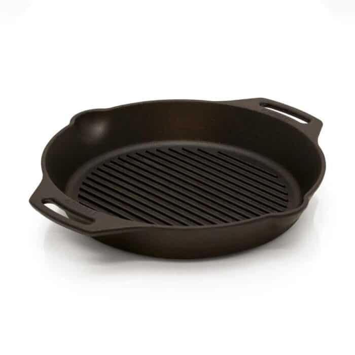 Het grillpatroon binnenin de Gietijzeren grill skillet met handvaten Petromax zorgt ervoor dat vlees, vis en groenten gegrild worden met het patroon dat normaal wordt bereikt met een BBQ rooster.