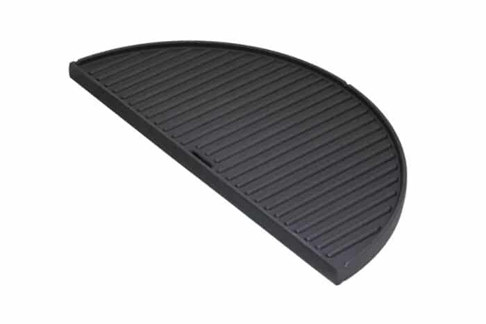 Zoals de naam al aangeeft, is de Gietijzeren plancha halve maan Monolith gemaakt van gietijzer. Dit materiaal is zeer duurzaam en geleidt hitte uitstekend, wat perfect is voor gelijkmatig koken op een barbecue.