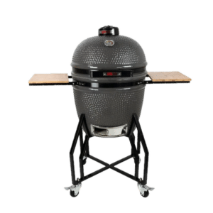 De Grill Guru Original Large beschikt over een roestvrij stalen grillrooster van ø 46 cm, een binnen vuurkorf en vuurring van vuurvast keramiek, een poeder coated frame op zwenkwielen met rem en twee handige bamboe inklapbare zijtafels. Daarnaast is het compleet met een plate setter, een regenhoes, een aspook en een flip grid grill.