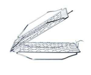 De grillmand is zacht voor etenswaren en is speciaal bedoeld voor delicate etenswaren. Hij heeft een scharnierende zijkant en de afmeting is 40,1 x 26,2 x 8,6 cm.