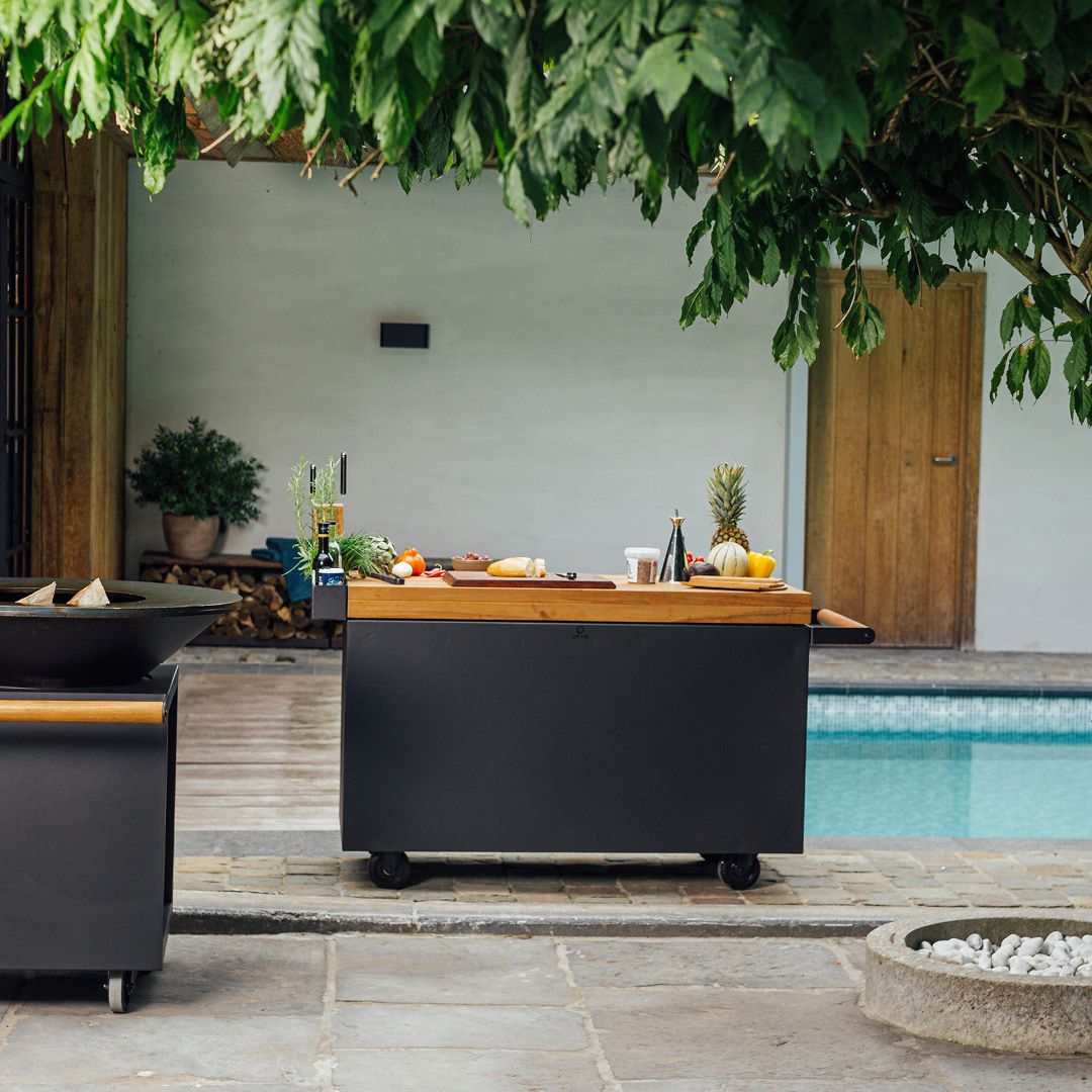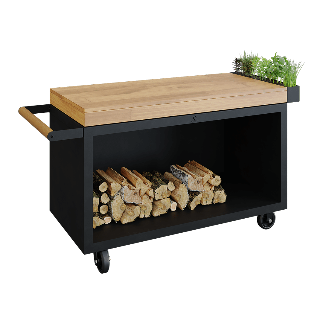 De OFYR 135 Mise en Place Table PRO Black, Teak Hout is ideaal voor BBQ en buiten koken ervaring. Het verhoogd oppervlak biedt voldoende ruimte voor voorbereiding en presentatie van etenswaren.