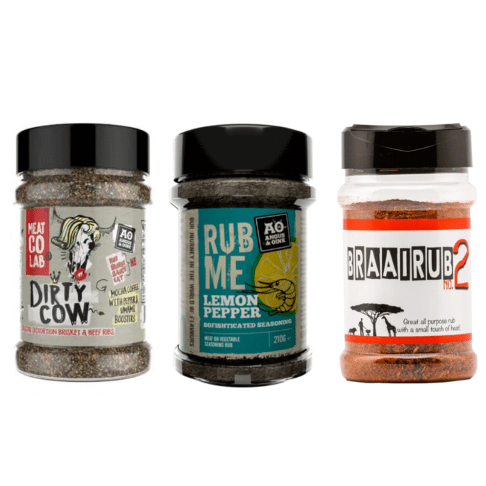 Onze favorieten rubs zijn de Braairub nr. 2, Dirty Cow van Angus & Oink, en de Seafood Lemon Pepper van Angus & Oink.
