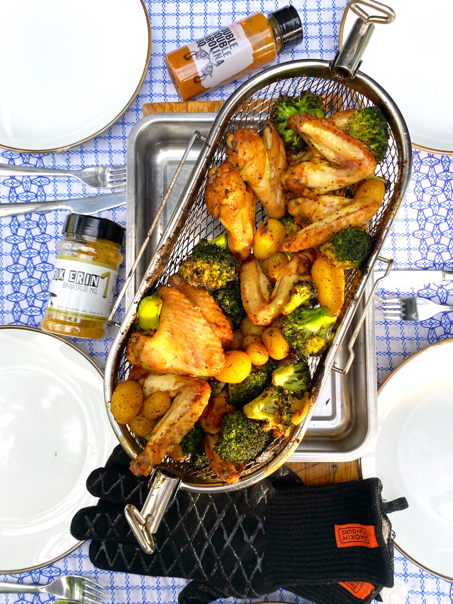 Het hoofdingrediënt van het Aardappelen, Groente, Vlees van het spit recept zijn de 10 kippenvleugels.