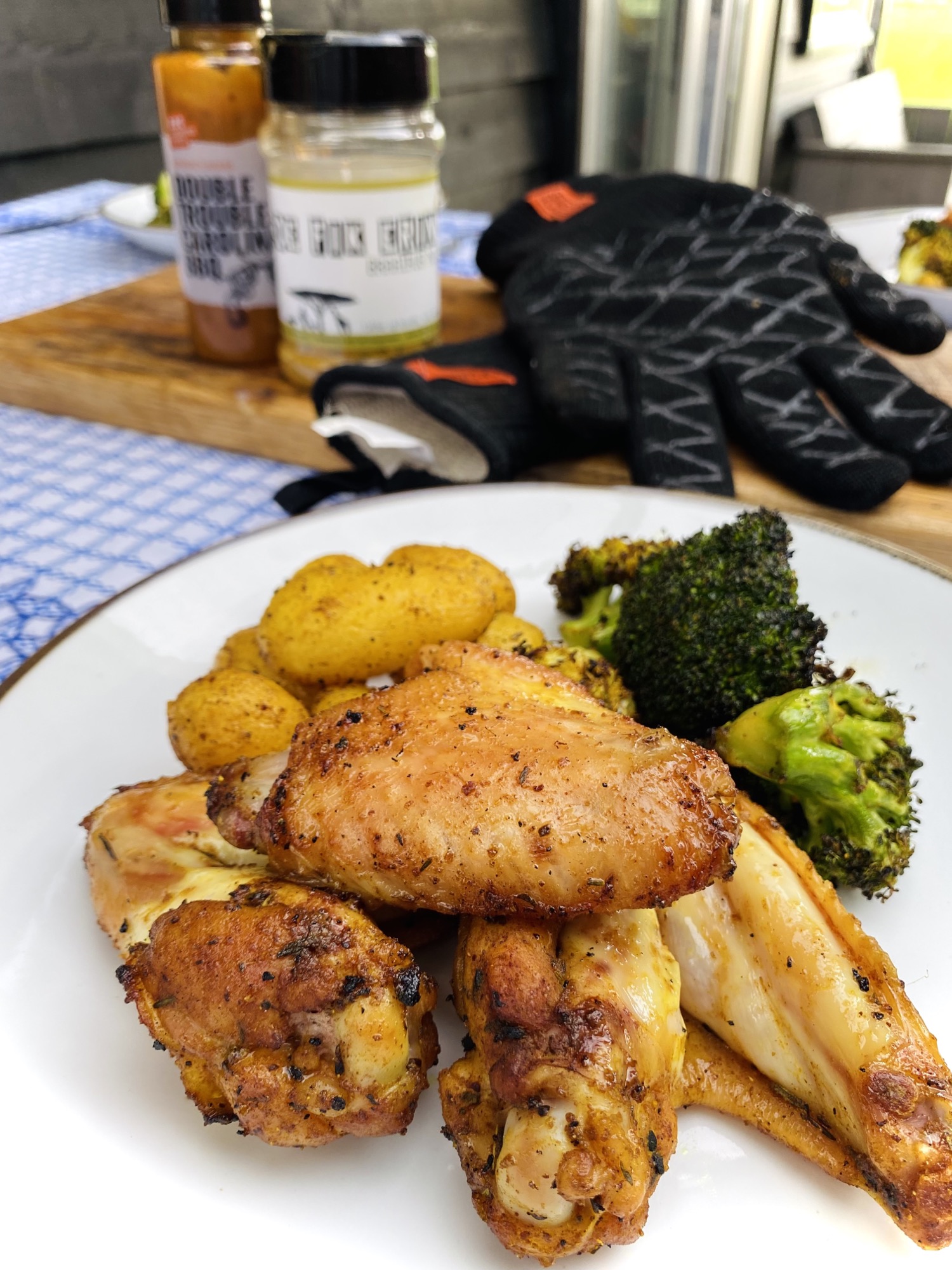 Open alleen de kamado om tussentijds met je kerntemperatuurmeter de kip te controleren. Doe dit in het dikste deel van de kippenvleugel en meet de temperatuur bij meerdere vleugels om er zeker van te zijn dat deze voldoende gaar zijn. De kip dient een kerntemperatuur van 74 graden Celsius te hebben.