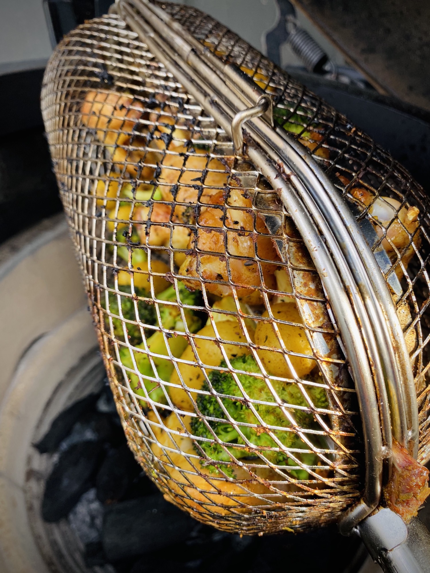 Als je het spit uitbreid met een grillmand dan kun je er nog veel meer kanten mee op. En deze Aardappelen, Groente, Vlees ofwel “A.G.V. van het spit” is er eentje van. Het mooie van dit gerecht is dat alles gelijkertijd in de korf kan en het geheel gelijkertijd klaar is. Het is bij een soortgelijke bereiding van belang dat de ingrediënten dezelfde garing nodig hebben. Dit kun je bereiken door ingrediëntente gebruiken met ongeveer dezelfde gaartijd. Paprika zal veel eerder te zacht worden ten overstaande van een stevige aardappel. Door de groentes kleiner te snijden en door sommige van te voren voor te koken kom je ook al een eind. Daarnaast is het ook een kwestie van proberen .