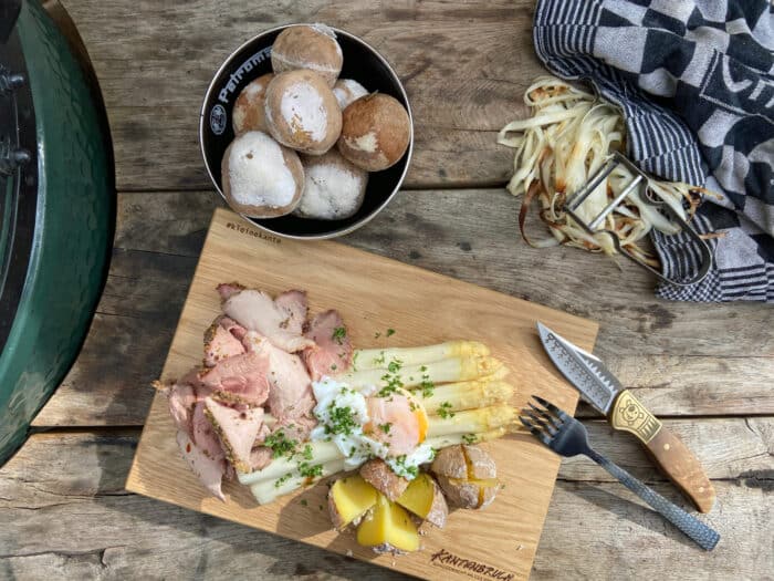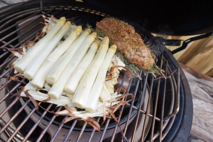 Je hebt de volgende benodigdheden: Plate setter (hitteschild), RVS rooster, Druippan, Koksmes, Snijplank, Aspergeschiller, Kookpannetje, Garden.