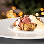 Hoofdgerecht: Runder Presa met gegaarde paddenstoelen, Hasselback aardappelen en gerookte bearnaisesaus