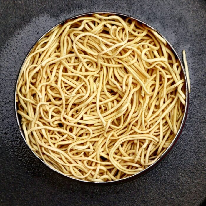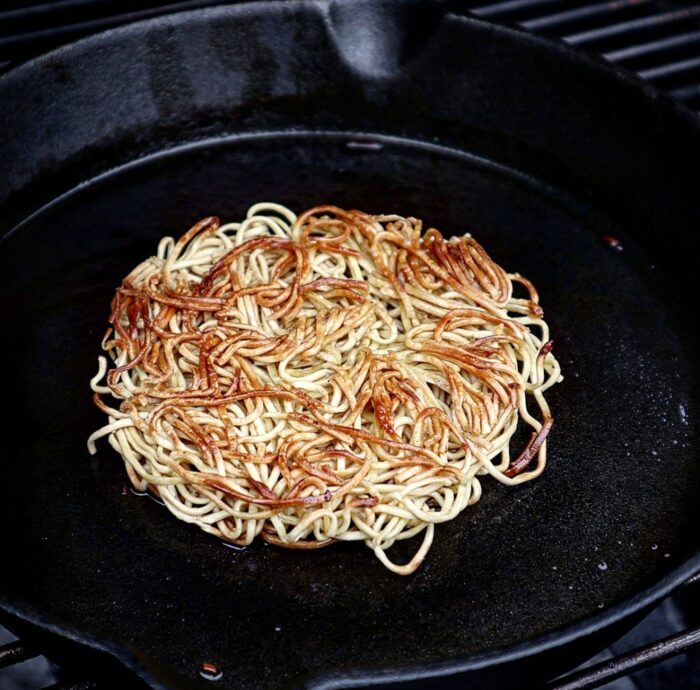 Doordat je de noedels heel kort kookt is deze al dente, dus plakkerig, omdat deze aan elkaar plakt en daarna gedoogd wordt in de bbq, vormt er een mooie bun die niet uit elkaar valt.