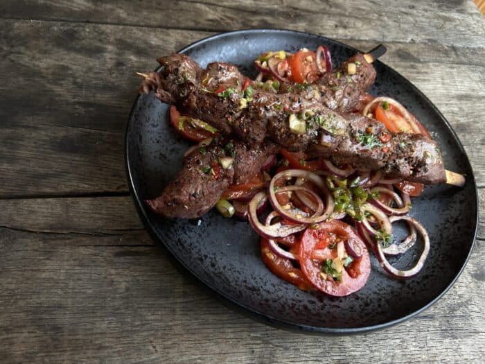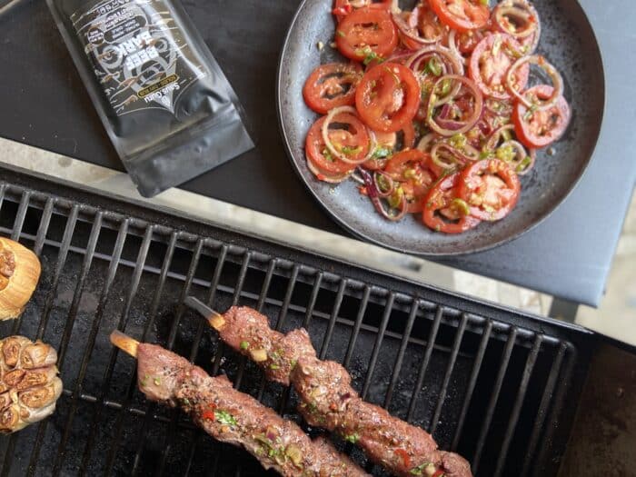 Wanneer de BBQ op temperatuur is grill de spiezen tot gewenste kerntemperatuur. 50ºC tot 53ºC voor medium-rare, 54ºC tot 57ºC voor medium. Alles hierboven vindt de hond erg lekker. Haal dan wel even het stokje eruit😉.