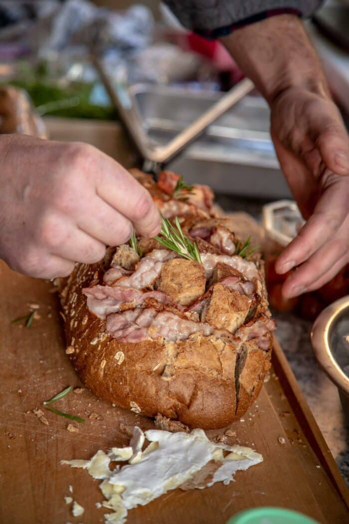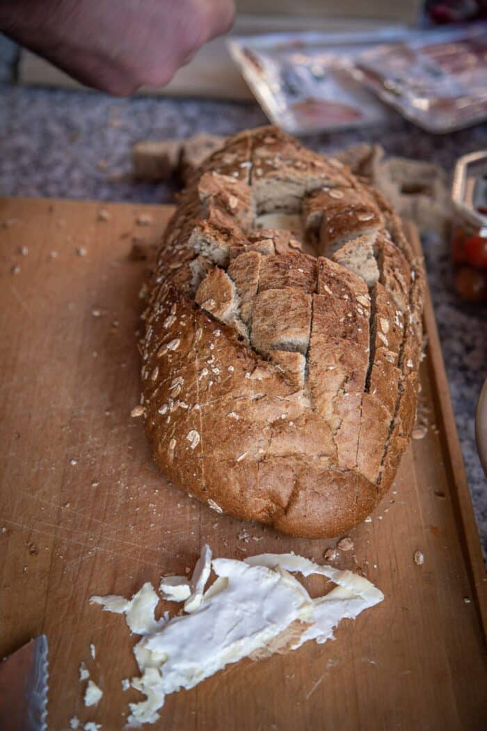 In het midden breken we ter doorsnede van een camembert de blokjes brood uit.