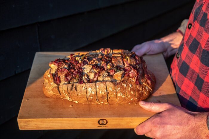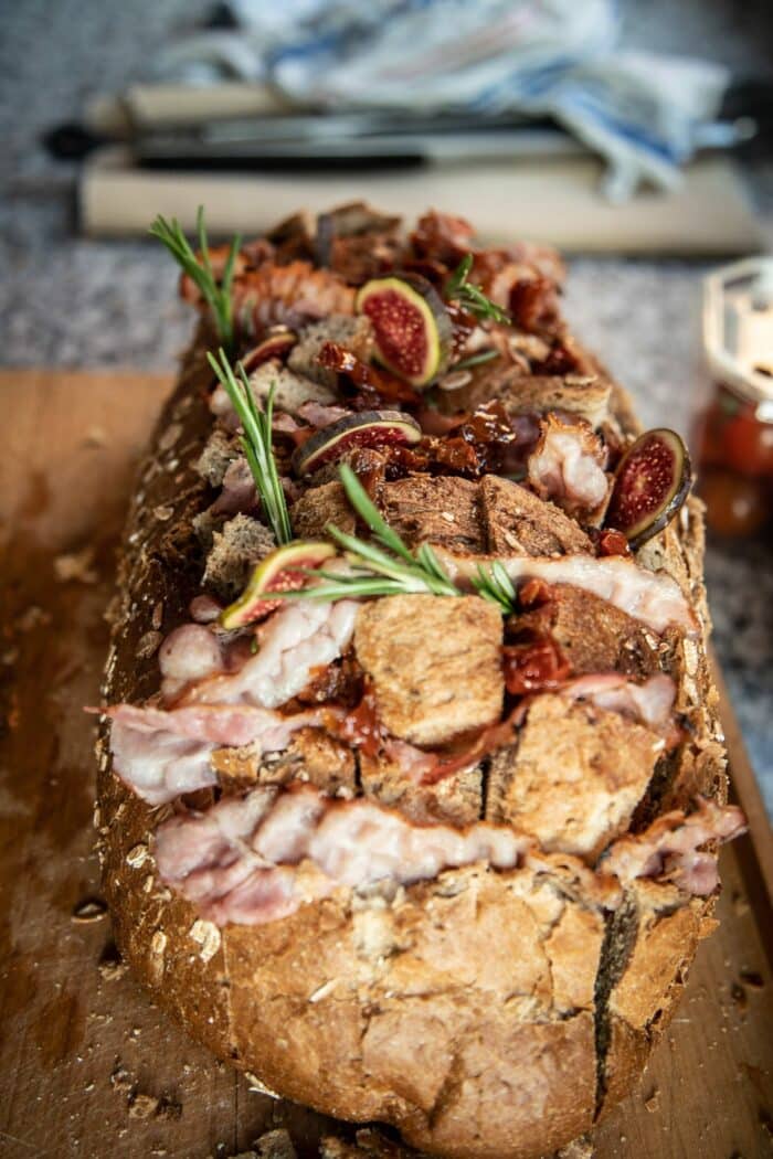 Haal de camembert uit de verpakking en snij met een scherp mes de bovenkant er af. Plaats de kaas in het midden van het brood. Stapel de blokjes brood terug om de kaas. De gegrilde bacon strips gaan verspreid tussen insnijdingen van het brood. Hierna kunnen we diverse lekkere ingrediënten en smaakversterkers toevoegen. Rozemarijn, zongedroogde tomaten en walnoten. Uit eigen tuin heb ik wat vijgen geplukt, in plakjes gesneden en er tussen gedaan. Uiteindelijk mooie smaken met verschillende texturen en een prachtig gerecht om te zien.