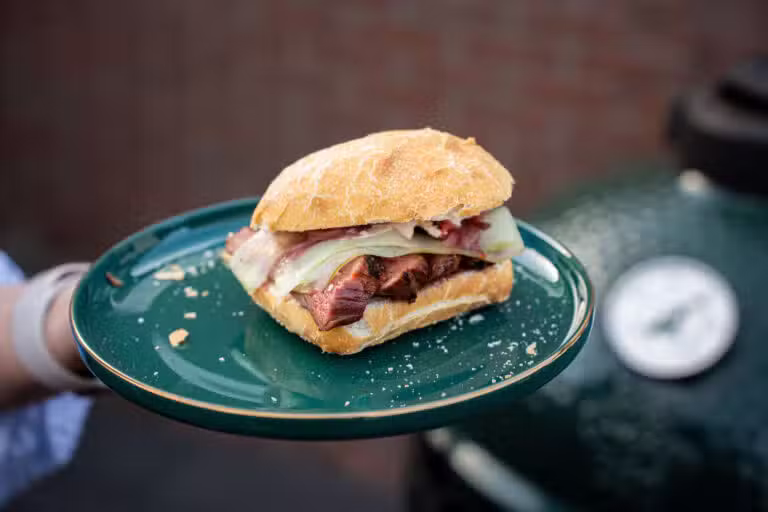 Haal de bavette daarna van de BBQ en laat het vlees 5 tot 10 minuten rusten onder een los stukje aluminiumfolie. Snijd de bavette vervolgens in dunne plakken tegen de draad in. Dat maakt echt verschil in hoe het vlees straks op het broodje eet.