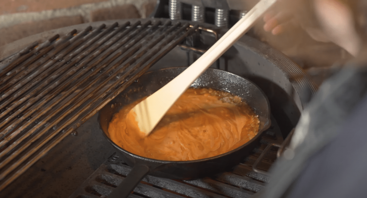 Zet de skillet op het indirecte gedeelte en laat de saus nog lekker in de kip trekken.