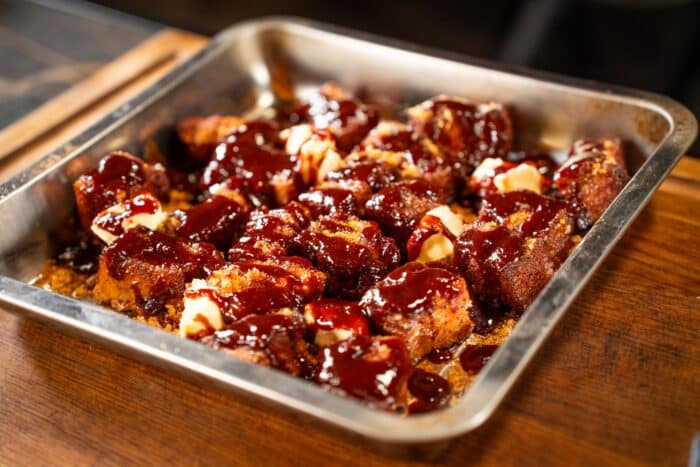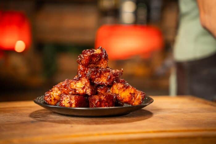 Serveer het buikspek burnt ends op een bordje of schaal eventueel met een cocktailprikker erbij voor de vorm. Maar grote kans dat ze rechtstreeks uit de schaal verdwijnen. Warm, kleverig en zó lekker.