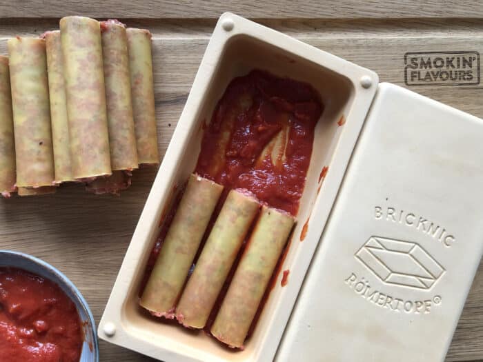Doe een schep van de saus in de Bricknic en verdeel deze over de bodem. Plaats 6 gevulde cannelloni’s op de bodem en bedek ze met de saus. Leg nog een laag van 6 cannelloni’s bovenop de saus en sluit af met de rest van de saus. Het is prima als er wat ‘kop’ ontstaat, aangezien er toch nog een holle deksel overheen gaat. Bedek de Bricknic met de deksel en plaats hem in je barbecue.