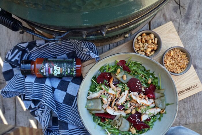 Dien de salade op in een diep bord of kom. Neem de bieten, snij hier nu dunne plakjes van en giet hier een goeie scheut bumbu bali overheen. Leg de bieten schijfjes nu op de salade. De kippendijen kun je op twee manieren serveren, of je pulled de kip of snijd ook hier dunne plakjes van. Verdeel de kip over de salades. Strooi nu de sesamzaadjes, pinda’s en gesneden bosui overheen.
