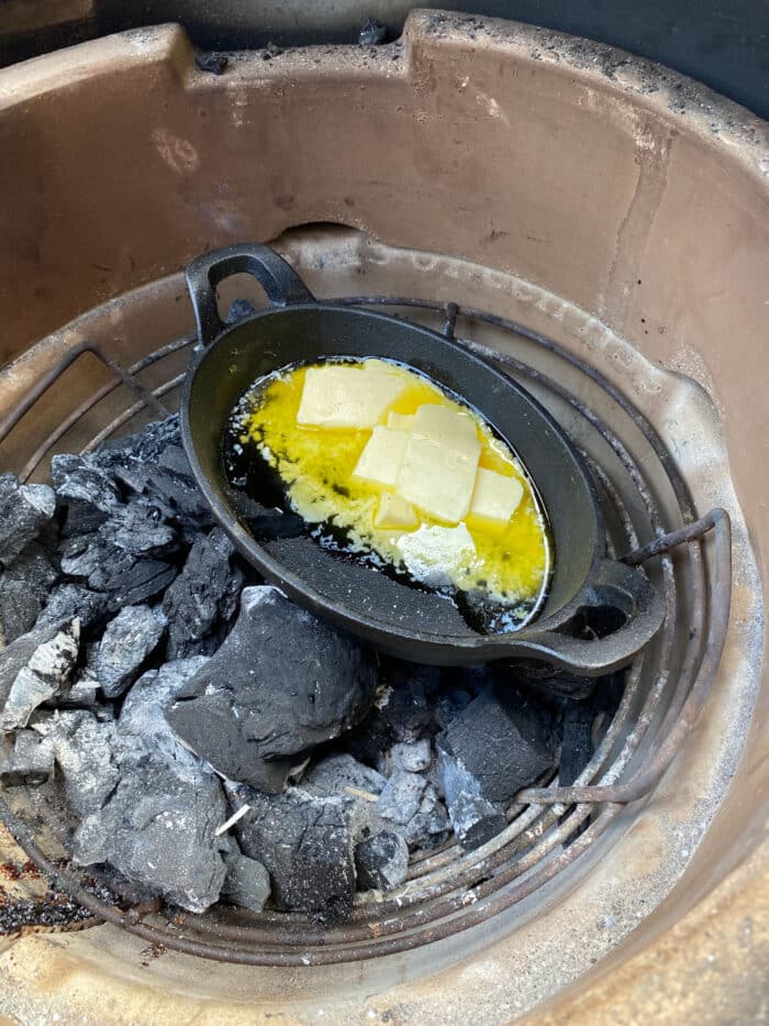 De benodigdheden die je nodig hebt voor dit recept zijn: een ovenschaal, siliconen kwast, skillet gietijzer, handschoenen, koksmes en een snijplank.