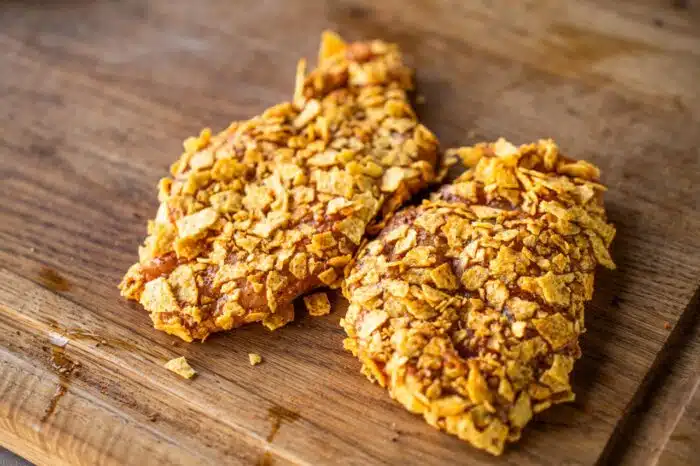 Rub de stukken filets in met BXC Chicken Winner, met deze rub krijg je de klassieke smaak van een Nashville hot chicken, maar gebruik vooral wat jij lekker vind. Laat het een kwartiertje intrekken, hoe langer je de rub in laat trekken, hoe meer smaak er straks in zit. Maak een paneerstraat door de bloem en maizena te mengen en dit mengsel in een bakje te doen. Kluts de eieren in een aparte bak en vermaal de Dorito’s tot grof kruim. Meng deze kruimels en breng op smaak met de BBQ-rub. Haal de gemarineerde kip door het bloem-maizena mengsel voor een lichte, egale coating, vervolgens door het eistrijksel en als laatste door de Doritos.