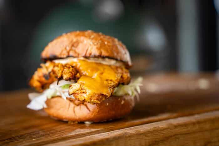 Plaats de gepaneerde kip in de BBQ op de geperforeerd grid en het hoogste niveau, maar wel direct. Gaar tot de kip rondom goudbruin is en een kerntemperatuur van 70 graden heeft bereikt. Leg een plak cheddar kaas op elke kipburger en laat deze smelten.