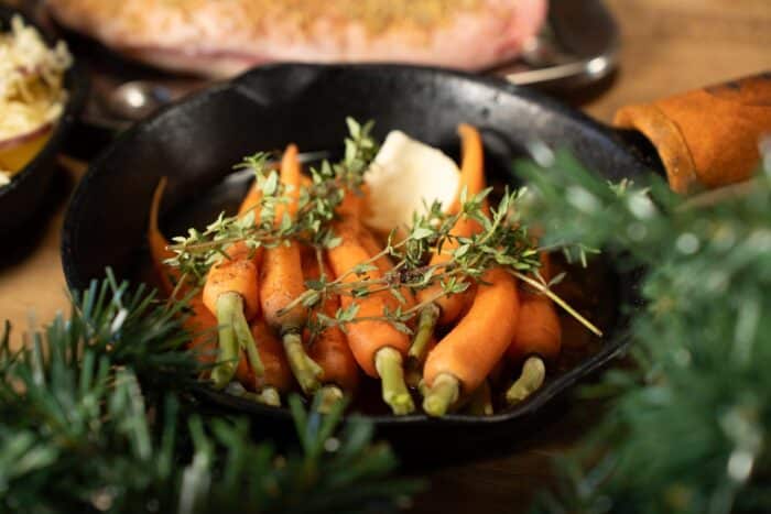 Voordat je de kleine wortelen (dit mogen ook grote wortelen zijn) gaat schillen met een dunschiller, snijd je het loof op ongeveer 5 cm boven de wortel af. Vervolgens doe je wat boter in een skillet met een klein beetje kalfsfond en voeg je de wortels toe en kruid je het met peper en zout en de verse tijm. Rooster deze ongeveer 20 minuten tot ze beetgaar zijn. Wanneer de wortels bijna gaar zijn voeg je de honing, walnoten en cranberry’s toe.