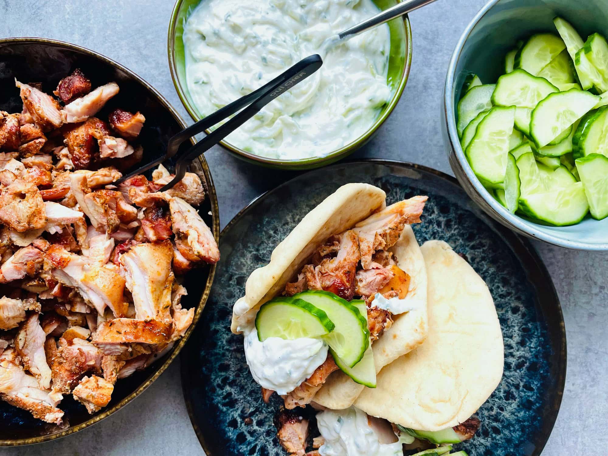 Je hebt nodig: 2 kg kipdijfilet, 1 tl zeezout, 3 tl paprikapoeder, ½ tl zwarte peper, ½ tl uienpoeder, 2 tl gemalen komijn, 4 tl gedroogde oregano, ½ tl chilivlokken, 2 tl gedroogde tijm, ½ tl speculaaskruiden, 2 tl knoflookpoeder, 1 tl versgeraspte citroenschil, 8 flatbreads, 500 gram Griekse yoghurt, 2 komkommers, 1 teen knoflook, olijfolie extra vergin, en een handje gedroogde dille.