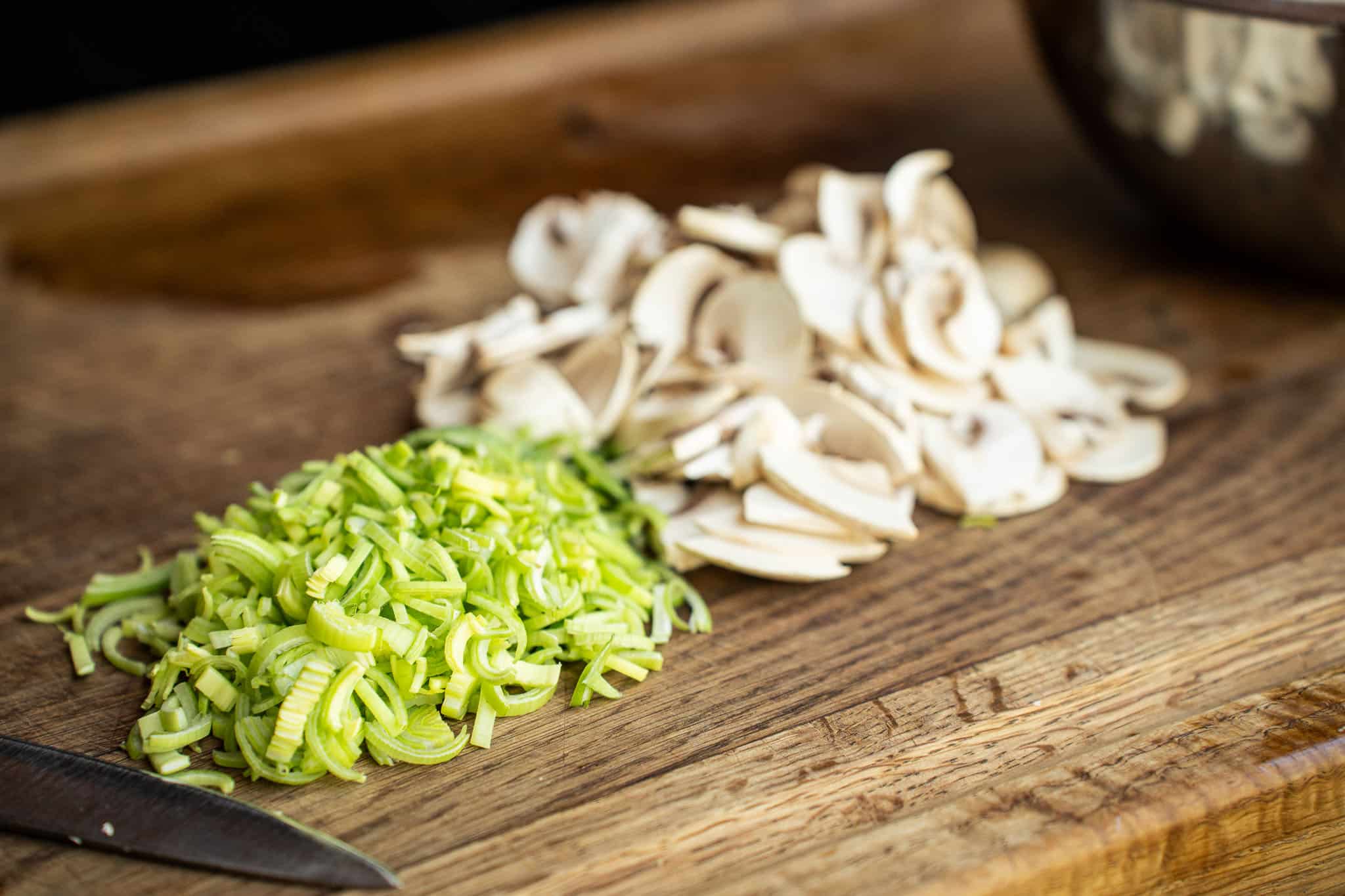 Snijd de champignons in kleine plakjes of stukjes, zodat ze straks mooi mee kunnen bakken in de skillet. De prei snijd je in dunne ringetjes. Houd alles vrij fijn, want dat werkt het prettigst in dit gerecht en zorgt ervoor dat het ei de groenten goed omsluit.