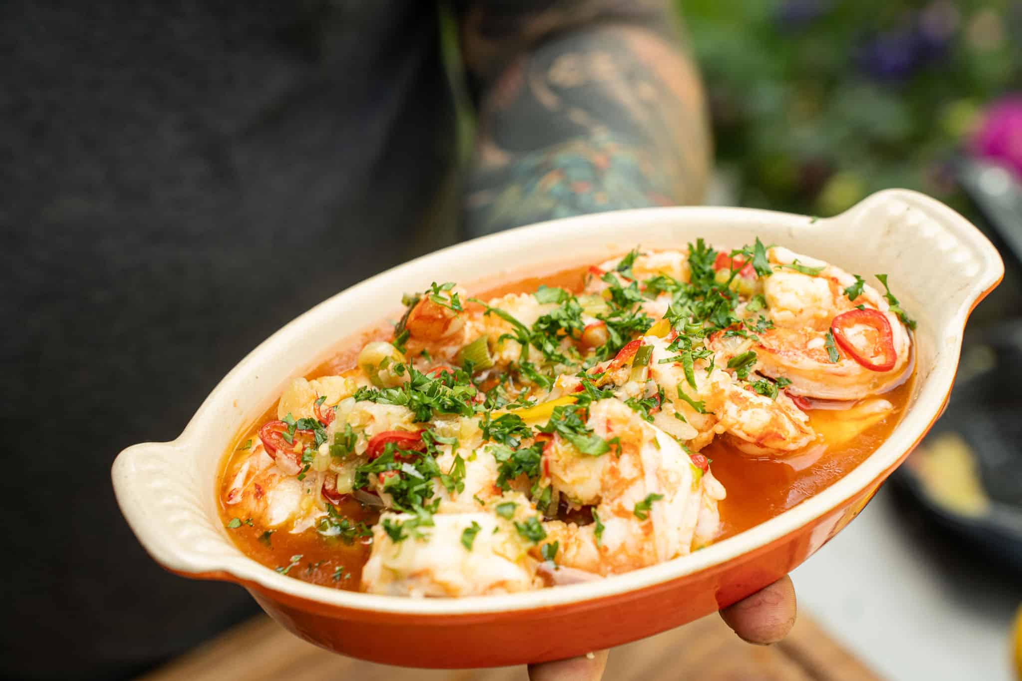 Leg vervolgens de gamba’s in de skillet en laat ze in de olie garen in ongeveer 3 tot 4 minuten. Draai ze halverwege even om. Zodra ze mooi verkleuren en stevig beginnen te worden, zijn ze klaar. Haal de skillet van de BBQ voordat de gamba’s te ver doorgaren.