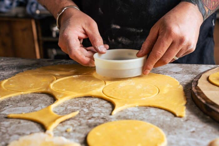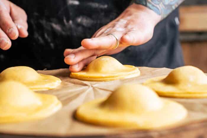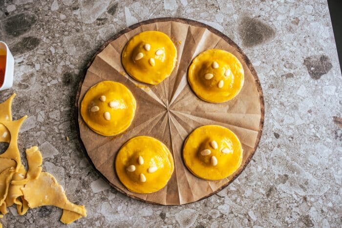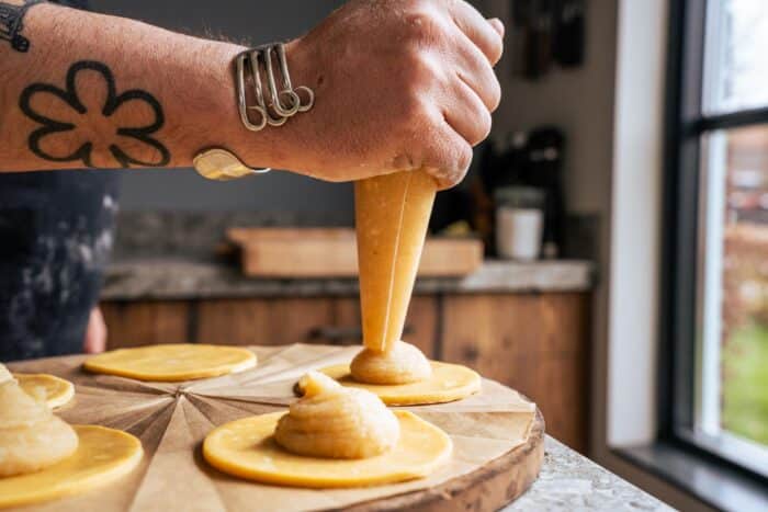 Rol het deeg uit tot een dikte van ongeveer 5 mm. Steek 12 cirkels uit met een diameter van 10 cm (voor 6 grote koeken). Leg de helft van de deegrondjes op een vel bakpapier en schuif dit op de koude pizzasteen. Spuit of schep in het midden van elk rondje een flinke toef vulling (ongeveer 35 gram). Leg er een tweede deegrondje bovenop, druk de randen voorzichtig aan en vorm de koeken met je holle handpalm. Druk de randen eventueel aan met een vork voor een mooi patroon.