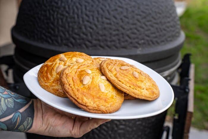 Verwarm de BBQ voor tot 200 °C met een indirecte opstelling (hitteschilden met daar boven het rvs rooster). Wanneer de BBQ op temperatuur is leg je de pizzasteen met de koeken op het rooster bijvoorbeeld met een pizzaschep en sluit de deksel. Bak ze in ongeveer 20 minuten goudbruin en krokant. Haal ze met de pizzaschep uit de BBQ. Laat ze daarna iets afkoelen… als je dat tenminste kunt weerstaan. Dan: genieten maar!