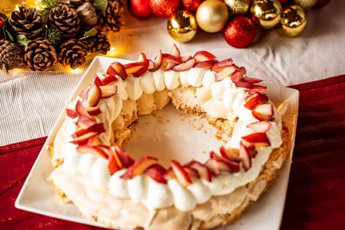 Kerst op z’n BBQ’s: een sneeuwwitte meringue-krans als echte kerstkrans, gevuld met fluweelzachte vanilleroom en bekroond met robijnrode stoofperen in wijn, port en winterse specerijen. Denk aan glühwein, maar dan in fruitvorm.