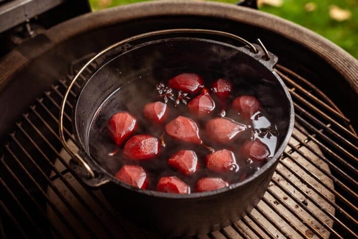 Zorg voor een volledig indirecte opstelling met hitteschilden of het multilevel-systeem. Daarna leg je een koude pizzasteen op het rooster en verwarm de dome naar 110 °C. Je schuift het bakpapier met de opgespoten krans op de koude pizzasteen (dit gaat het makkelijkste met behulp van je pizzaschep). Daarna sluit je de dome en laat de krans rustig drogen op 110 °C. Je wilt een droge buitenkant en een licht taaie kern; reken grofweg 90-120 minuten, afhankelijk van je BBQ en de dikte van de krans. Houd de kleur in de gaten: wit blijft de bedoeling. Zet intussen de Dutch Oven met de peren ook indirect in de BBQ op 110 °C. Laat de peren stoven niet koken tot ze mooi gaar zijn en een diepe kleur hebben. Geef ze de tijd; ze zijn klaar wanneer je er gemakkelijk met een mespunt in prikt. Laat daarna in het vocht afkoelen. Zodra ze zijn afgekoeld kan je het pocheervocht afbinden met aardappelzetmeel.