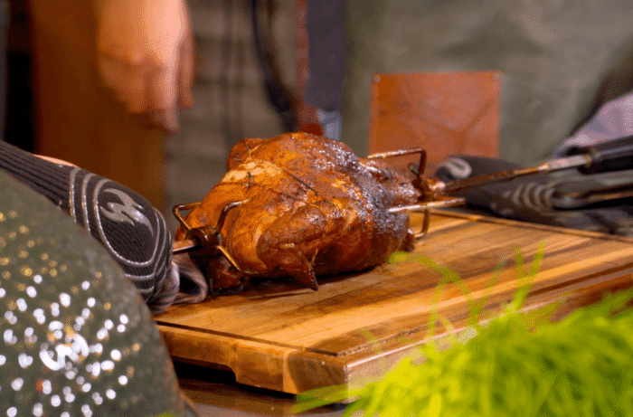 Spies de kip in het geheel tussen de haken en zorg dat deze mooi in het midden van de kamado valt. Leg de aluminium lekbak onder het spit zodat het vet in de bak valt en niet in de kolen. Anders krijg je een vieze vette rook in je kip. Leg een mooi groot stuk sinaasappelhout in de houtskool, dit geeft een mooie volle rooksmaak.