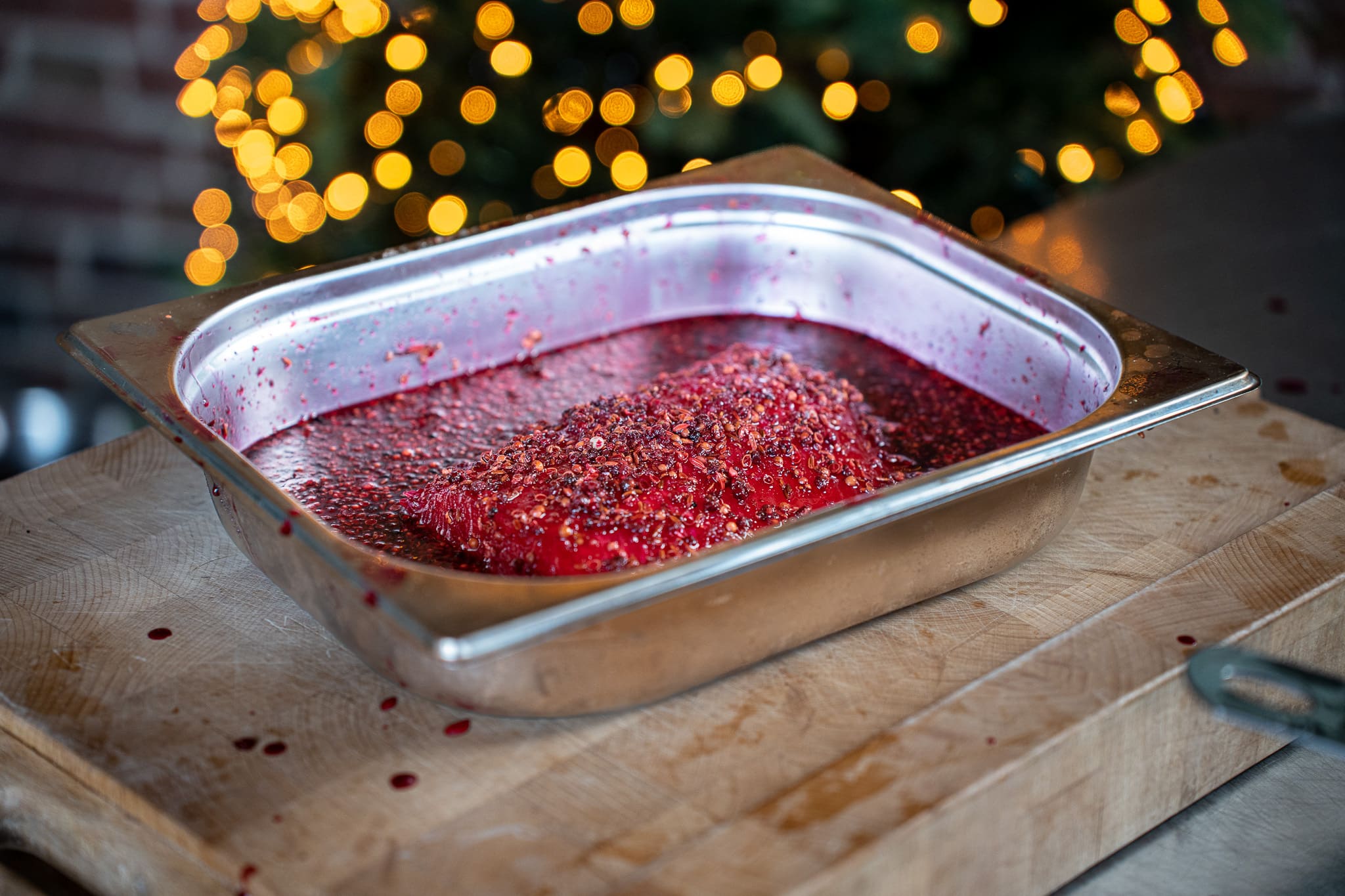 Allereerst weeg je de specerijen af en rooster je op het gasfornuis, in een droge skillet de specerijen kort aan. Als de specerijen zijn geroosterd, vermaal deze dan in de vijzel, zodat er meer smaak en aroma vrij komen. Vervolgens meng je het zout en de suiker bij elkaar en mix hier de specerijen door. Wanneer het allemaal gemixt is, doe je de gin en het bietensap erbij en meng je dit door elkaar. Door het bietensap en de pekel zal je zalm knalrood worden en krijg je een mooi kleurcontrast. Doe de zalmrugfilet in een passende bak en pak deze in met de verkregen pekel en laat hem vervolgens 48 uur afgedekt pekelen in de koelkast.