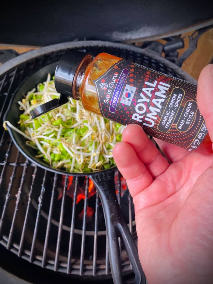 Als je pan op temperatuur is mag er een scheutje olijfolie in en gevolgd door de bonen. Roerbak deze twee minuten waarna de taugé en lente-ui er bij mag. Bak deze al roerend zo’n 1-2 minuten en de laatste minuut gaat nog de Saus.Guru Royal umami er bij.