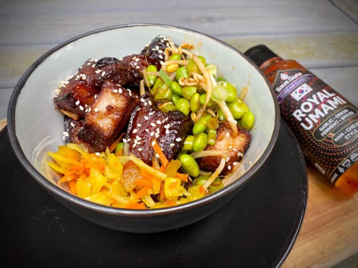 De ingrediënten voor de Oosterse Pork Belly Burnt Ends zijn: 1 kg buikspek zonder zwoerd, voor de Marinade: 2 el donkere basterdsuiker, 4 el honing, 1 tl sesamolie, 2 tl five spices, 2 tenen knoflook, 2 tl chillivlokken, 5 el ketjap, 5 el soja saus en verder heb je nodig 3-4 eetlepels Boter, 3-4 eetlepels donkerbruine basterdsuiker, 3-4 eetlepels Sausguru royal umami, Olijfolie, 125 gram taugé, 1 lente-ui, en 300 gram diepgevroren edamame bonen.