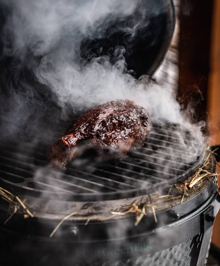 TIP: Als je wilt kun je het laatste uur van de bereiding de beenham nog extra roken. Verdeel hiervoor het hooi uit de folie over de gloeiende houtskool.