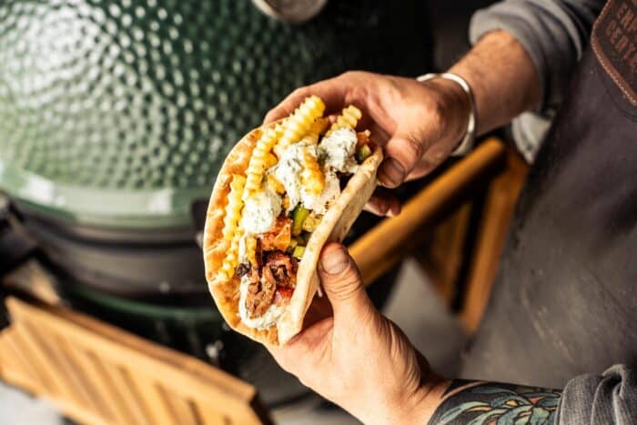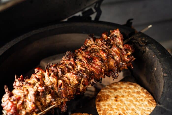 Steek de barbecue aan en stel deze in met het spit. Breng de temperatuur naar 160 graden Celsius en laat het vlees ongeveer 45 minuten rustig draaien. Zet daarna de schuiven van de kamado verder open en verhoog de temperatuur naar 200 graden Celsius. Hierdoor krijgt de gyros een krokantere buitenkant. Snijd het buitenste gedeelte van het vlees af en laat de gyros verder draaien tot deze ook weer goudbruin en krokant is. Herhaal dit proces totdat alle gyros op is.