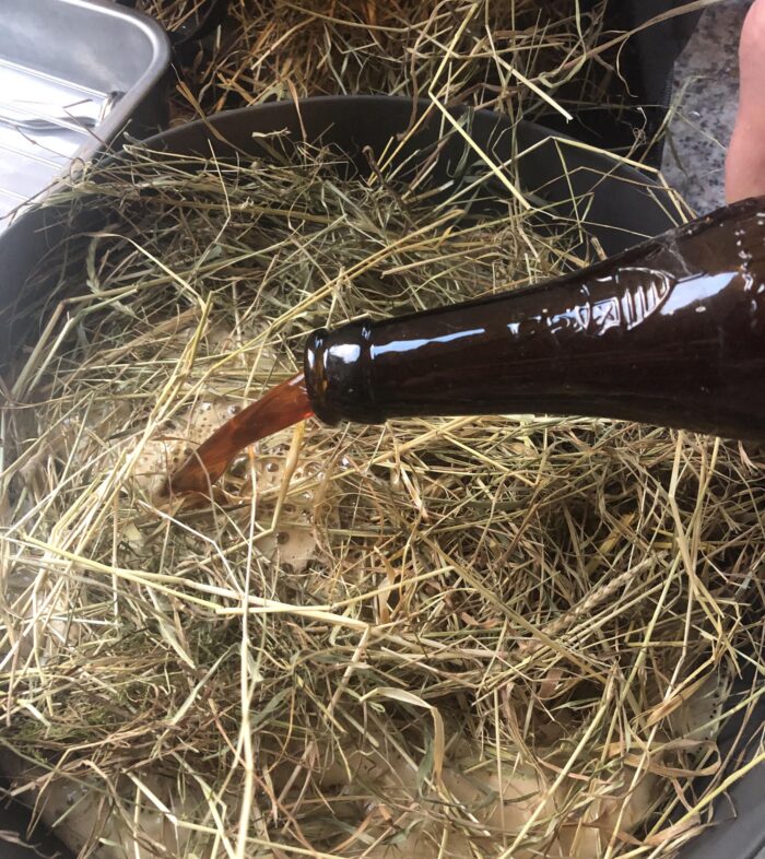 De binnenkant gaan we opvullen met in bier geweekt hooi. Neem hiervoor een braadslede, vul deze met twee flesjes bruin bier en leg een handvol hooi in. Terwijl het hooi weekt in het bier, zullen we het vel van de kip was los werken bij de borst en de poten. Zodoende kunnen we de aan te brengen rub ook onder de huid op het vlees aanbrengen waardoor de smaken beter intrekken. Met de hand verdeel je de rub goed door het in te wrijven.
