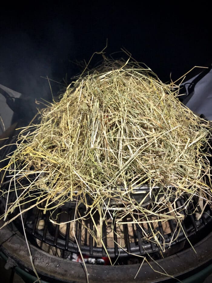 Dek de gehele kip goed af met de rest van het droge hooi. Voorkom dat het er naast komt. Het hooi mag natuurlijk niet langs de platesetter in contact komen met de kolen! Laat nu de kip rustig garen tot de kerntemperatuur bereikt is. Controleer tussendoor de hoeveelheid bier in de braadslede. Vul regelmatig bij met water om te voorkomen dat dit droog kookt.