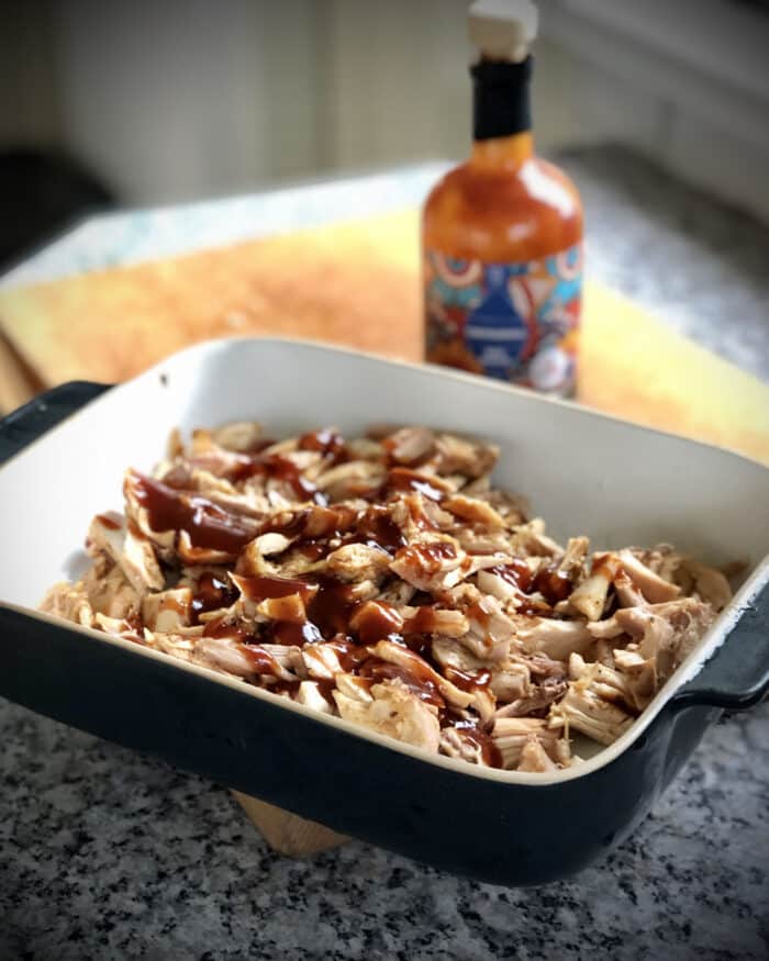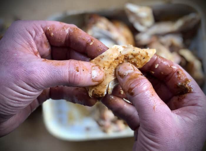 Als de kip de 75 graden heeft bereikt dan verwijderen we al het hooi en laten hem nog even rusten onder het aluminiumfolie. Maak de braadslede schoon zodat we hierin de kippen kunnen gaan pullen. Met de handen gaan we het mooie vlees scheiden van de onbruikbare delen. Alle botjes, het vel, vet en pezen wordt verwijderd.