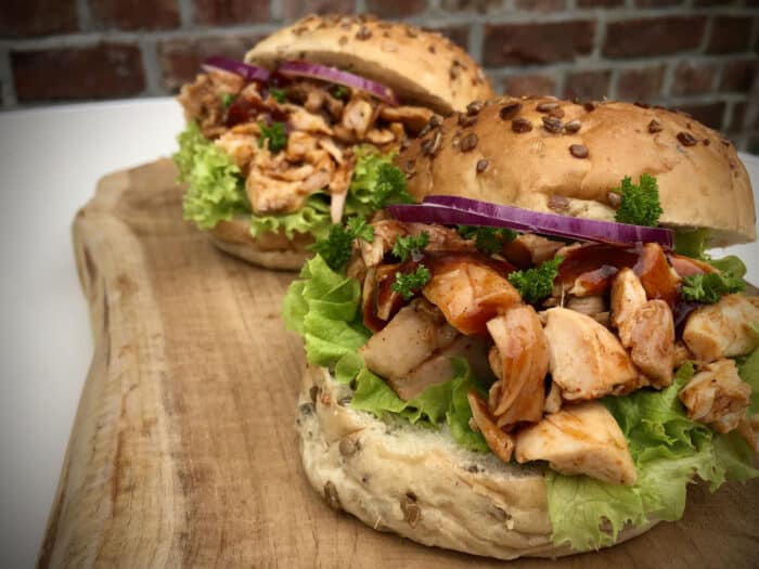 Snij de broodjes open en beleg deze met frisse krulsla. Om een betere verwerking kun je het kippenvlees nog wat kleiner snijden. Meng er naar smaak de barbecue saus bij. Breng een mooie hoeveelheid aan op het broodje en maak het af met peterselie, extra saus en enkele ringen rode ui.
