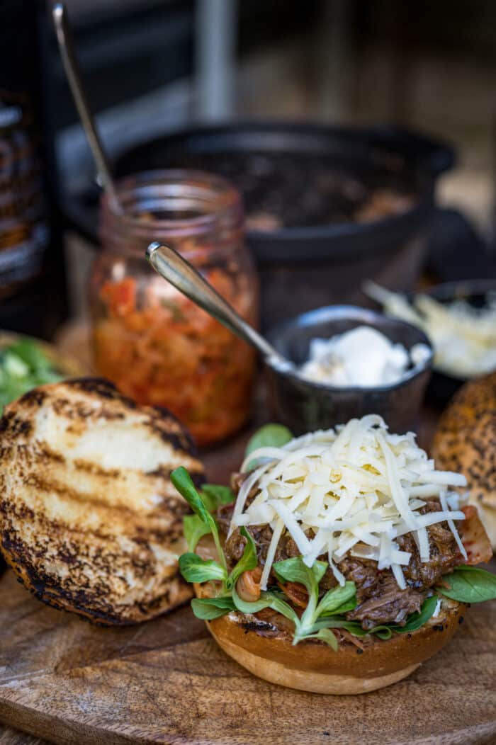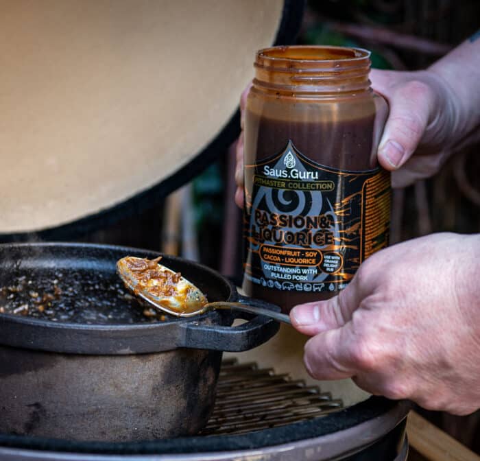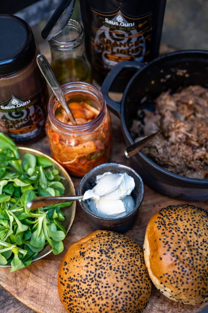Je hebt 2 Brioche bollen, 250 gr Pulled pork, 2 el crème fraiche, Kimchi, Veldsla, Passion Liquorice saus, Orange Delight rub en Geraspte Emmentaler nodig voor dit recept.
