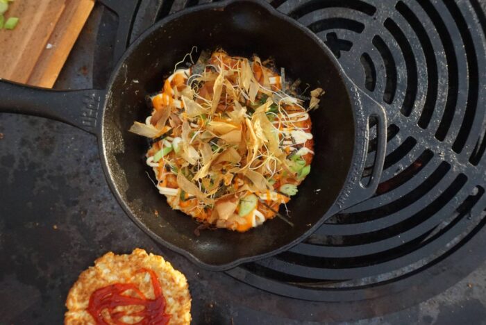 Ik heb bij dit gerecht gekozen om een gietijzeren skillet te gebruiken. Ik heb de skillet boven een vuurring bbq geplaatst zodat de vuurring de pannenkoeken die klaar waren warm kon houden. Door gebruik van de skillet kun je iedere type bbq gebruiken voor dit gerecht. Eventueel ook op een plancha mogelijk.